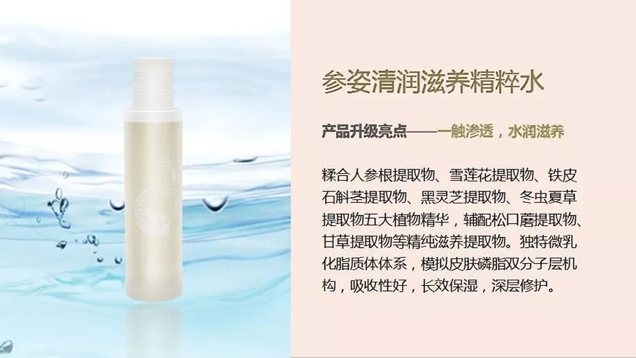 全面升级后的参姿清润滋养护肤系列,通过模拟皮肤结构,加入独特微乳化脂质化体系和独特液晶乳化结构,在皮肤表面形成规则的油脂矩阵,高效渗透,吸收更强,保湿更长久,补水更见效。