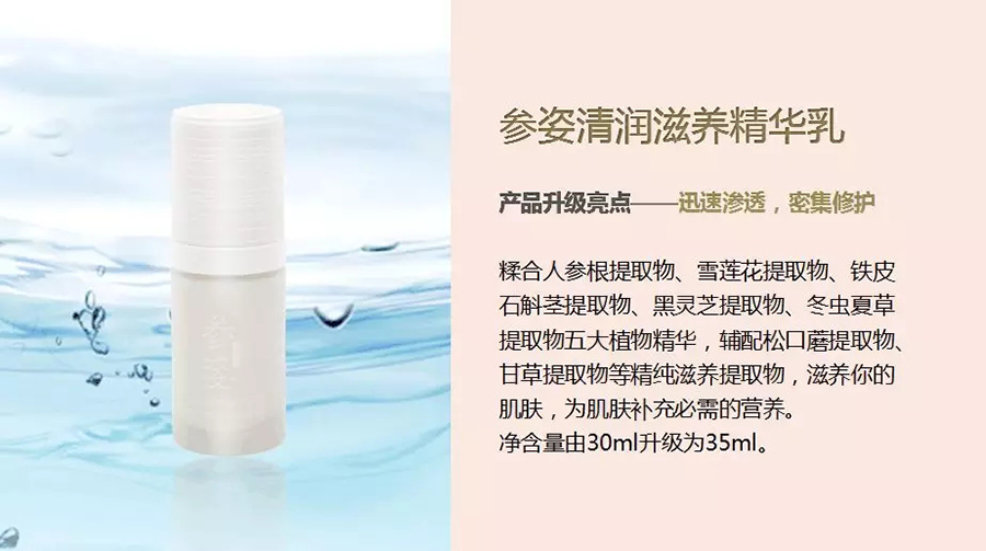 全新上市的参姿护肤系列,每一款产品均进行了成分、功效、技术、包装等一系列的升级改造,能为肌肤补充更多营养,起到更好的补水、滋养、抗衰老等功效。值得推荐给每一位爱美人士的超补水护肤品!