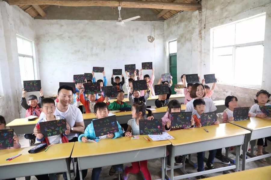 “康美爱心大使”李雪给一年级的孩子们带来音乐课和绘画课,并送去画纸和彩笔。